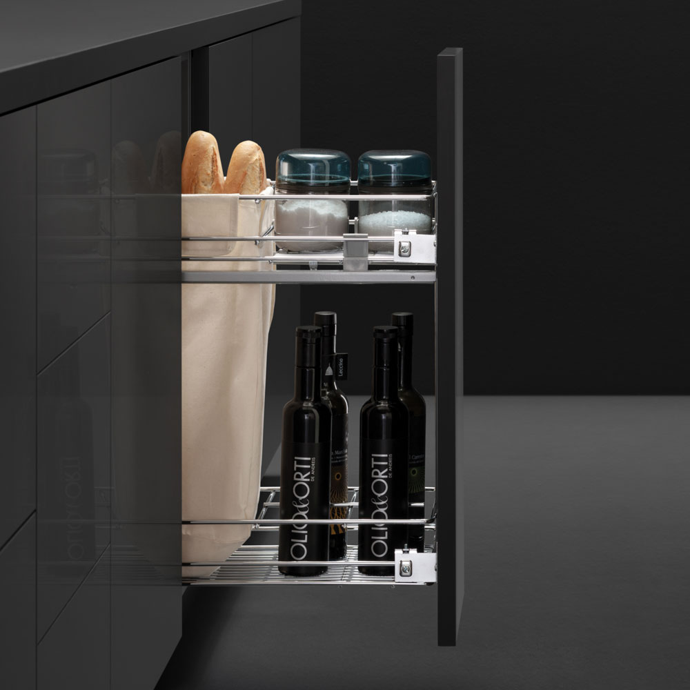 Botellero panero equipado con guía Hettich de extracción parcial de 90%. Para módulo de 300, 264x470x520 mm Ajustable para costado 16 / 19mm Cromado Soft Closing Fijaciones incluidas.